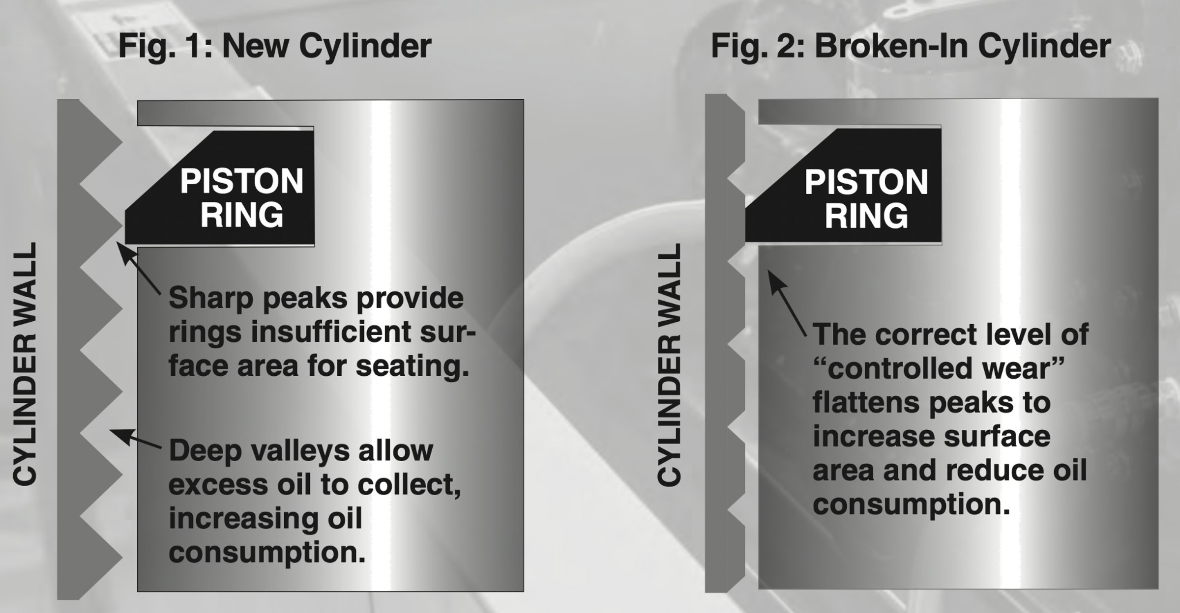 Freedom Series Break-In Oil’s friction-modifier-free formula allows the sharp peaks on newly honed cylinder walls (fig. 1) to partially flatten. The result produces more surface area for rings to seat against, allowing the formation of a dynamic seal that increases compression, horsepower and torque (fig. 2).